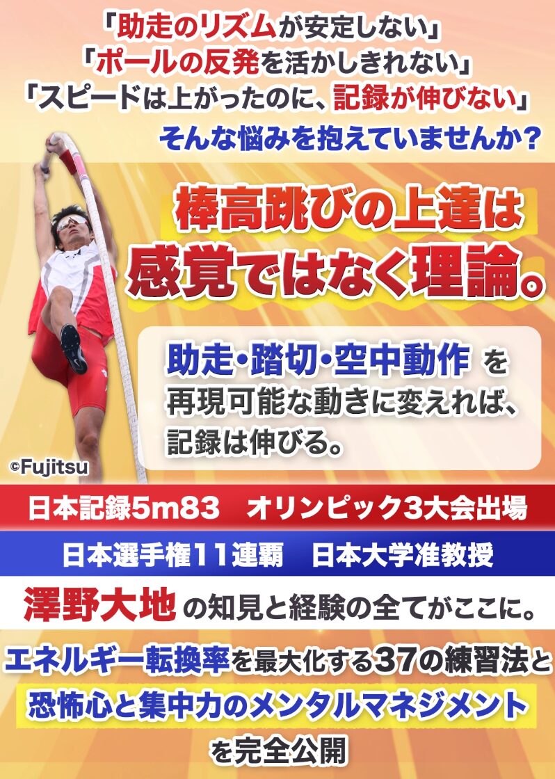 高く跳ぶために必要な「身体の使い方」「技術のポイント」、そして試合で実力を発揮するための「メンタルコントロール法」を公開。日本記録保持者・オリンピック3大会出場の澤野大地が現役時代の映像を振り返りながら、記録を伸ばせたポイントや技術的な変化を詳しく解説します。